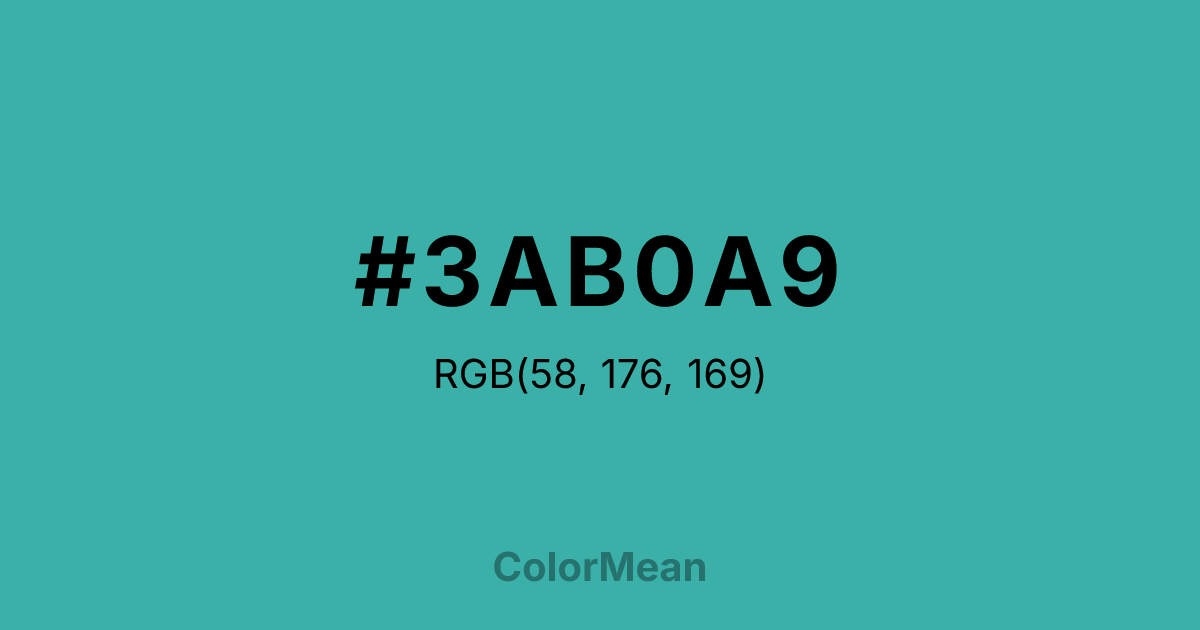 #3AB0A9 RGB value is (58, 176, 169). The hex color red value is 58, green is 176, and blue is 169. Its HSL format shows a hue of 176°, saturation of 50 percent, and lightness of 46 percent. The CMYK process values are 67 percent, 0 percent, 4 percent, 31 percent.
