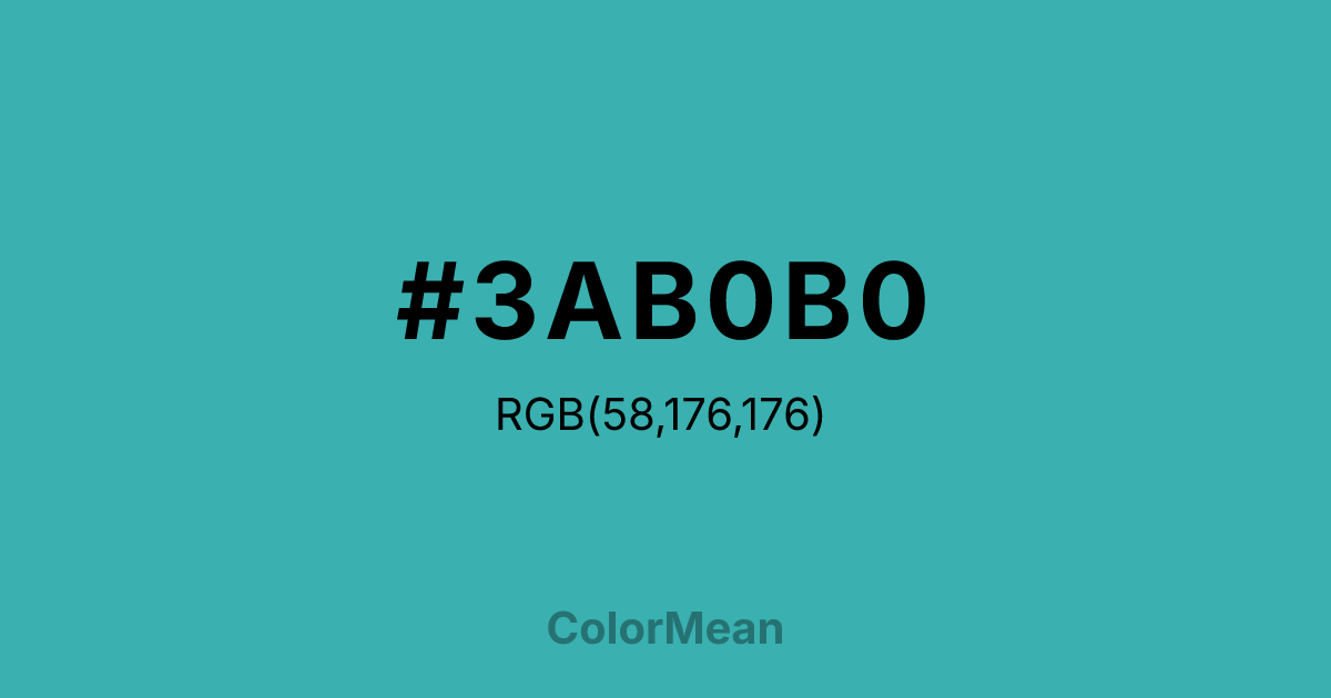 #3AB0B0 RGB value is (58, 176, 176). The hex color red value is 58, green is 176, and blue is 176. Its HSL format shows a hue of 180°, saturation of 50 percent, and lightness of 46 percent. The CMYK process values are 67 percent, 0 percent, 0 percent, 31 percent.