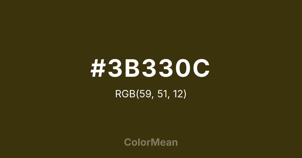 #3B330C RGB value is (59, 51, 12). The hex color red value is 59, green is 51, and blue is 12. Its HSL format shows a hue of 50°, saturation of 66 percent, and lightness of 14 percent. The CMYK process values are 0 percent, 14 percent, 80 percent, 77 percent.