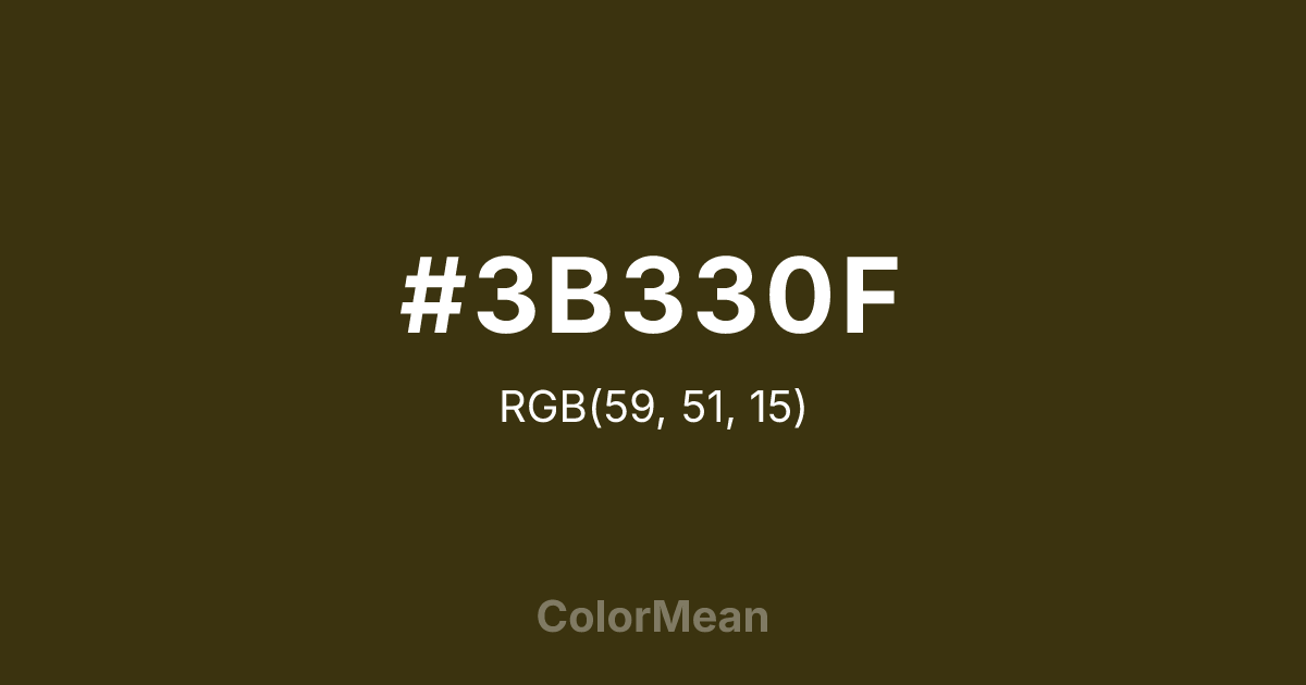 #3B330F RGB value is (59, 51, 15). The hex color red value is 59, green is 51, and blue is 15. Its HSL format shows a hue of 49°, saturation of 59 percent, and lightness of 15 percent. The CMYK process values are 0 percent, 14 percent, 75 percent, 77 percent.