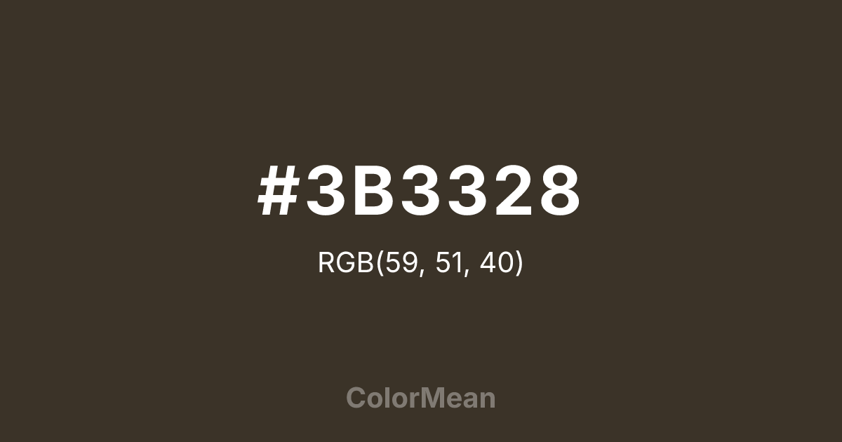 #3B3328 RGB value is (59, 51, 40). The hex color red value is 59, green is 51, and blue is 40. Its HSL format shows a hue of 35°, saturation of 19 percent, and lightness of 19 percent. The CMYK process values are 0 percent, 14 percent, 32 percent, 77 percent.