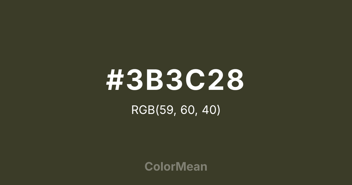#3B3C28 RGB value is (59, 60, 40). The hex color red value is 59, green is 60, and blue is 40. Its HSL format shows a hue of 63°, saturation of 20 percent, and lightness of 20 percent. The CMYK process values are 2 percent, 0 percent, 33 percent, 76 percent.