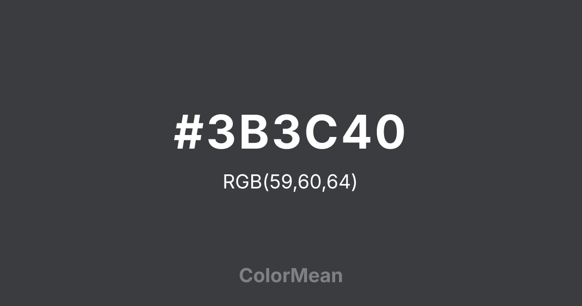 #3B3C40 RGB value is (59, 60, 64). The hex color red value is 59, green is 60, and blue is 64. Its HSL format shows a hue of 228°, saturation of 4 percent, and lightness of 24 percent. The CMYK process values are 8 percent, 6 percent, 0 percent, 75 percent.