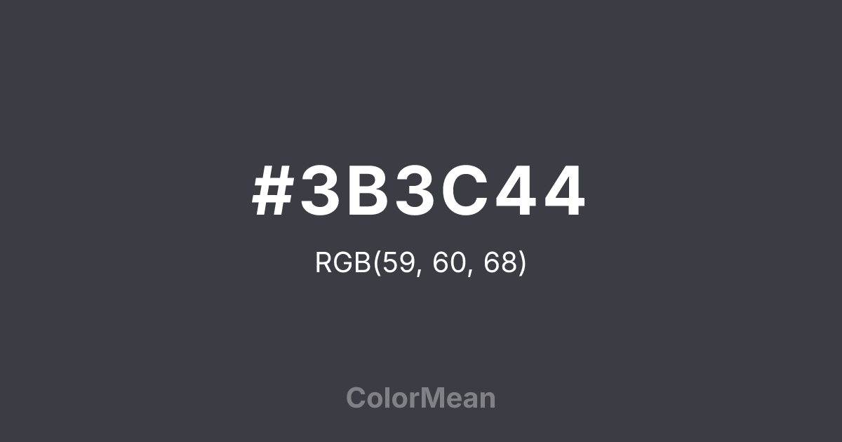 #3B3C44 RGB value is (59, 60, 68). The hex color red value is 59, green is 60, and blue is 68. Its HSL format shows a hue of 233°, saturation of 7 percent, and lightness of 25 percent. The CMYK process values are 13 percent, 12 percent, 0 percent, 73 percent.