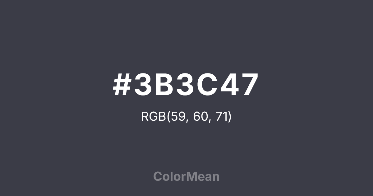 #3B3C47 RGB value is (59, 60, 71). The hex color red value is 59, green is 60, and blue is 71. Its HSL format shows a hue of 235°, saturation of 9 percent, and lightness of 25 percent. The CMYK process values are 17 percent, 15 percent, 0 percent, 72 percent.
