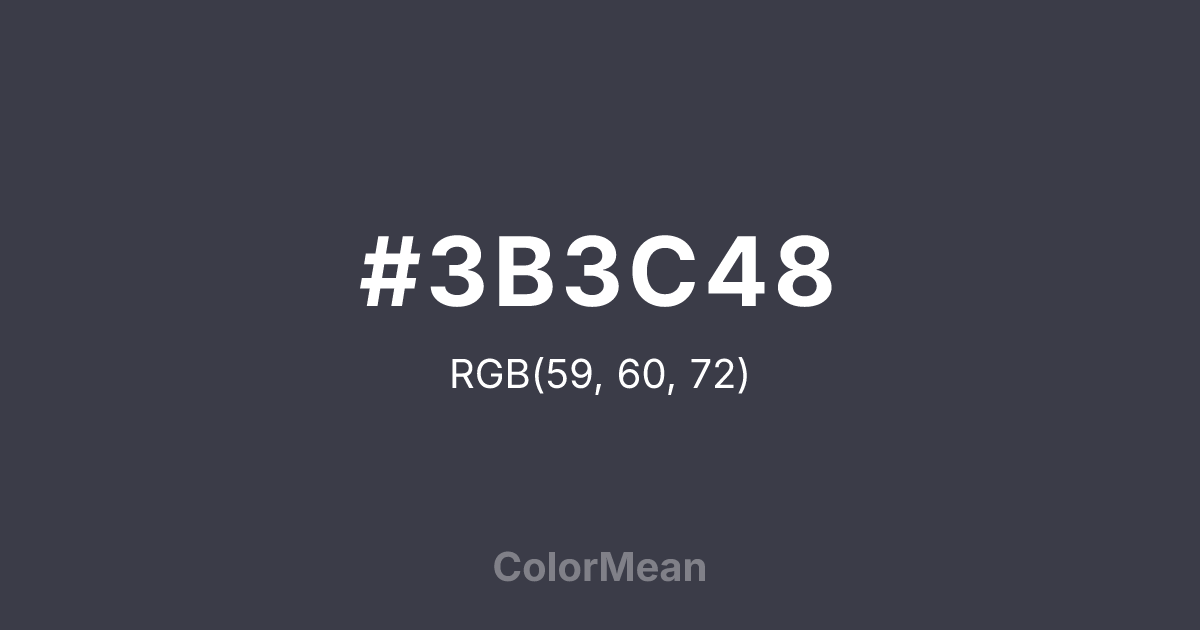 #3B3C48 RGB value is (59, 60, 72). The hex color red value is 59, green is 60, and blue is 72. Its HSL format shows a hue of 235°, saturation of 10 percent, and lightness of 26 percent. The CMYK process values are 18 percent, 17 percent, 0 percent, 72 percent.