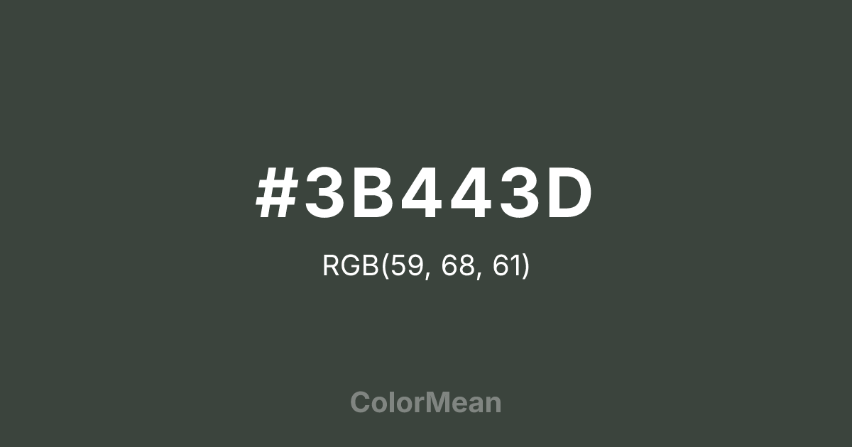 #3B443D RGB value is (59, 68, 61). The hex color red value is 59, green is 68, and blue is 61. Its HSL format shows a hue of 133°, saturation of 7 percent, and lightness of 25 percent. The CMYK process values are 13 percent, 0 percent, 10 percent, 73 percent.
