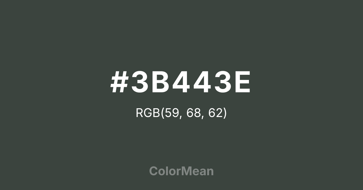 #3B443E RGB value is (59, 68, 62). The hex color red value is 59, green is 68, and blue is 62. Its HSL format shows a hue of 140°, saturation of 7 percent, and lightness of 25 percent. The CMYK process values are 13 percent, 0 percent, 9 percent, 73 percent.