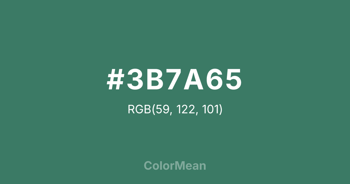 #3B7A65 RGB value is (59, 122, 101). The hex color red value is 59, green is 122, and blue is 101. Its HSL format shows a hue of 160°, saturation of 35 percent, and lightness of 35 percent. The CMYK process values are 52 percent, 0 percent, 17 percent, 52 percent.