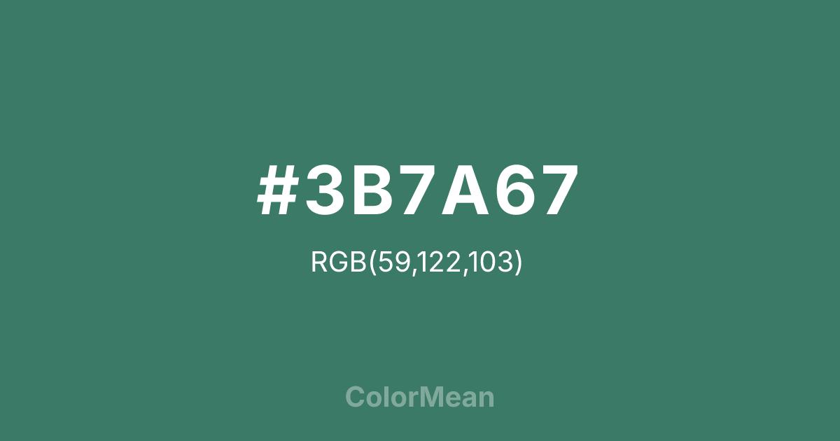 #3B7A67 RGB value is (59, 122, 103). The hex color red value is 59, green is 122, and blue is 103. Its HSL format shows a hue of 162°, saturation of 35 percent, and lightness of 35 percent. The CMYK process values are 52 percent, 0 percent, 16 percent, 52 percent.