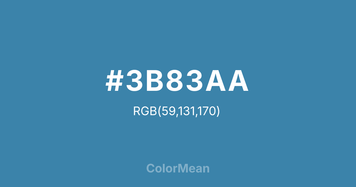 #3B83AA RGB value is (59, 131, 170). The hex color red value is 59, green is 131, and blue is 170. Its HSL format shows a hue of 201°, saturation of 48 percent, and lightness of 45 percent. The CMYK process values are 65 percent, 23 percent, 0 percent, 33 percent.