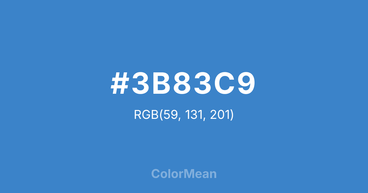 #3B83C9 RGB value is (59, 131, 201). The hex color red value is 59, green is 131, and blue is 201. Its HSL format shows a hue of 210°, saturation of 57 percent, and lightness of 51 percent. The CMYK process values are 71 percent, 35 percent, 0 percent, 21 percent.
