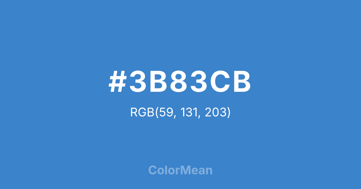 #3B83CB RGB value is (59, 131, 203). The hex color red value is 59, green is 131, and blue is 203. Its HSL format shows a hue of 210°, saturation of 58 percent, and lightness of 51 percent. The CMYK process values are 71 percent, 35 percent, 0 percent, 20 percent.