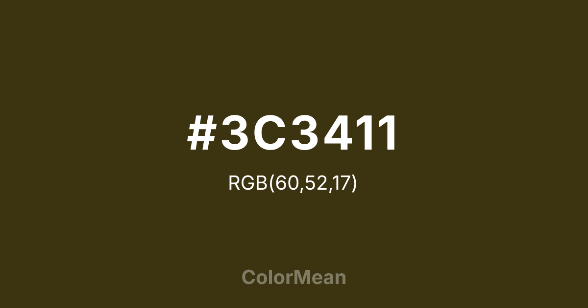 #3C3411 RGB value is (60, 52, 17). The hex color red value is 60, green is 52, and blue is 17. Its HSL format shows a hue of 49°, saturation of 56 percent, and lightness of 15 percent. The CMYK process values are 0 percent, 13 percent, 72 percent, 76 percent.