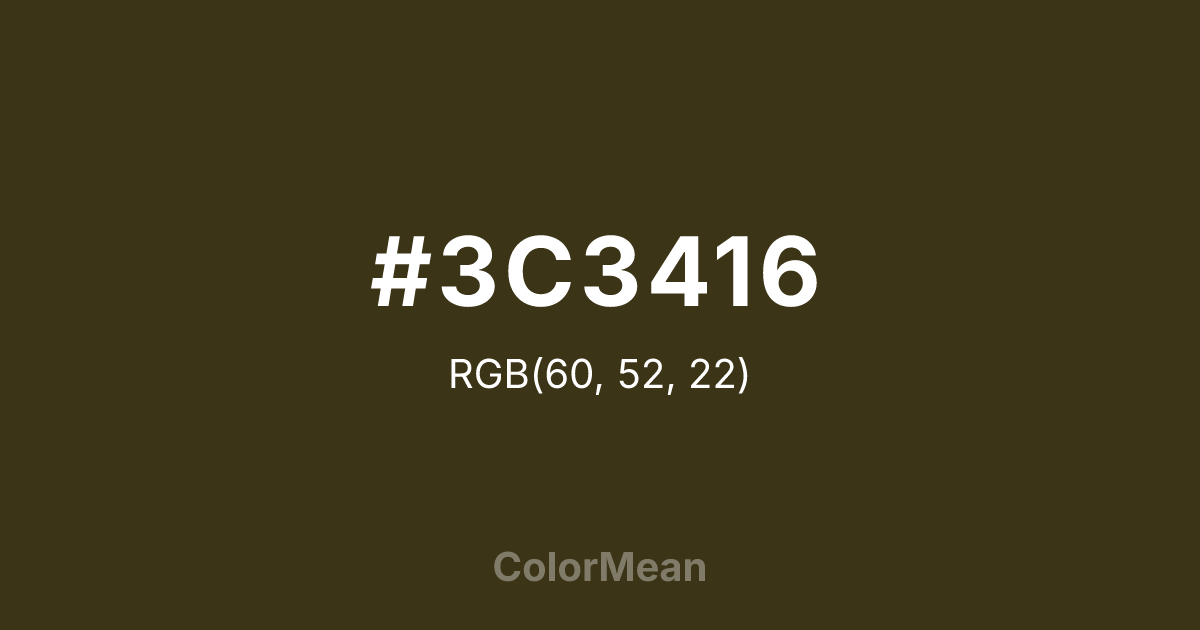#3C3416 RGB value is (60, 52, 22). The hex color red value is 60, green is 52, and blue is 22. Its HSL format shows a hue of 47°, saturation of 46 percent, and lightness of 16 percent. The CMYK process values are 0 percent, 13 percent, 63 percent, 76 percent.
