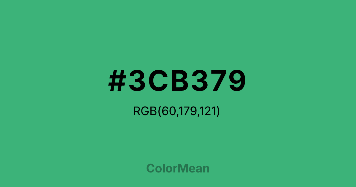 #3CB379 RGB value is (60, 179, 121). The hex color red value is 60, green is 179, and blue is 121. Its HSL format shows a hue of 151°, saturation of 50 percent, and lightness of 47 percent. The CMYK process values are 66 percent, 0 percent, 32 percent, 30 percent.