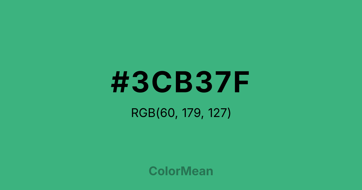 #3CB37F RGB value is (60, 179, 127). The hex color red value is 60, green is 179, and blue is 127. Its HSL format shows a hue of 154°, saturation of 50 percent, and lightness of 47 percent. The CMYK process values are 66 percent, 0 percent, 29 percent, 30 percent.