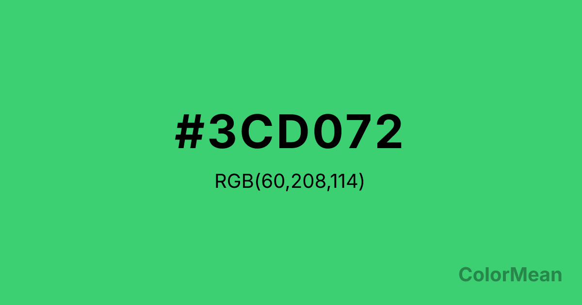 #3CD072 RGB value is (60, 208, 114). The hex color red value is 60, green is 208, and blue is 114. Its HSL format shows a hue of 142°, saturation of 61 percent, and lightness of 53 percent. The CMYK process values are 71 percent, 0 percent, 45 percent, 18 percent.