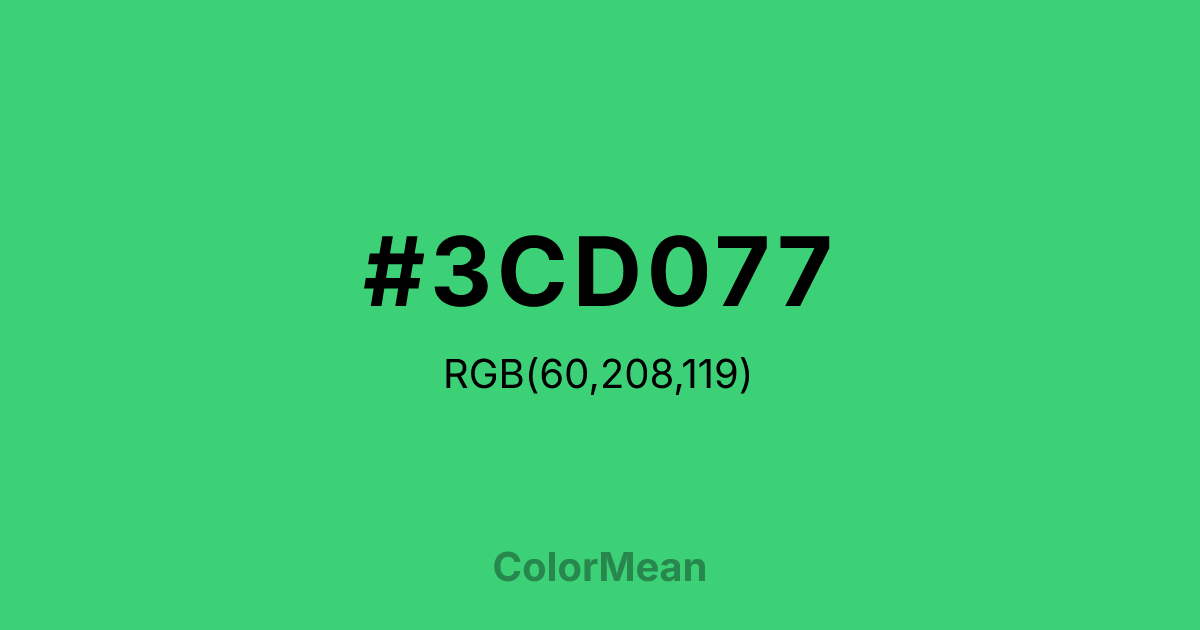 #3CD077 RGB value is (60, 208, 119). The hex color red value is 60, green is 208, and blue is 119. Its HSL format shows a hue of 144°, saturation of 61 percent, and lightness of 53 percent. The CMYK process values are 71 percent, 0 percent, 43 percent, 18 percent.