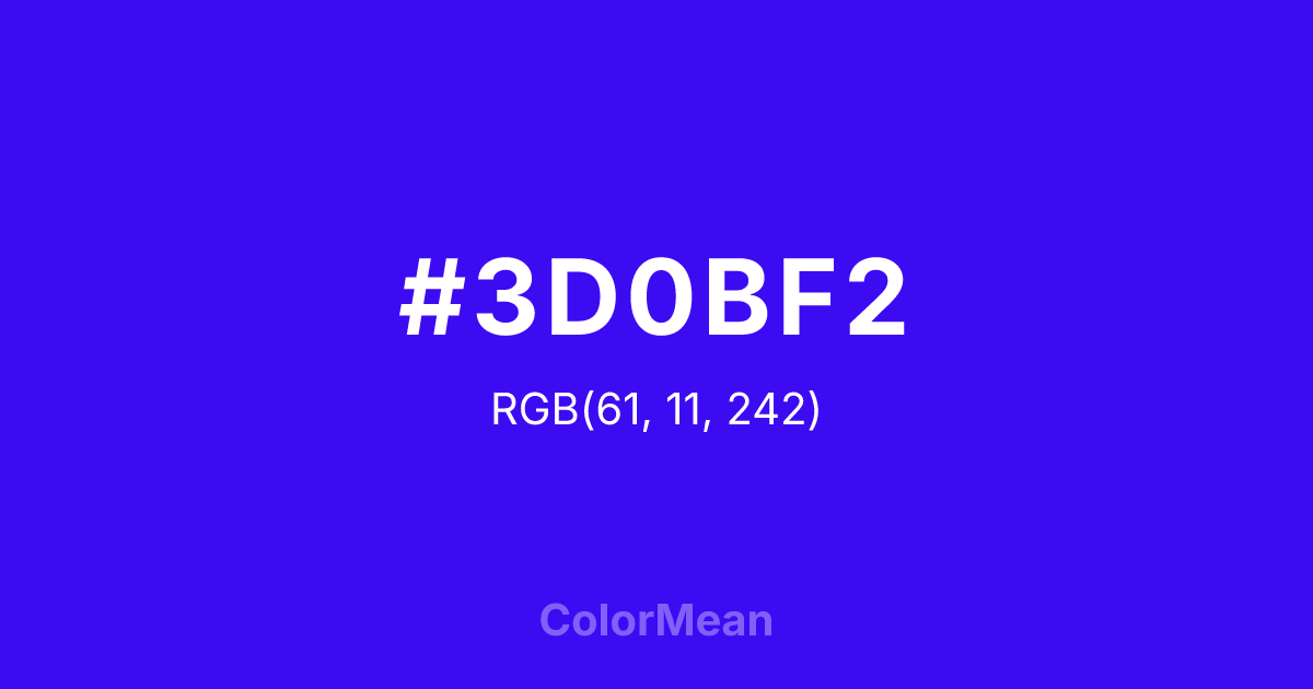 #3D0BF2 RGB value is (61, 11, 242). The hex color red value is 61, green is 11, and blue is 242. Its HSL format shows a hue of 253°, saturation of 91 percent, and lightness of 50 percent. The CMYK process values are 75 percent, 95 percent, 0 percent, 5 percent.