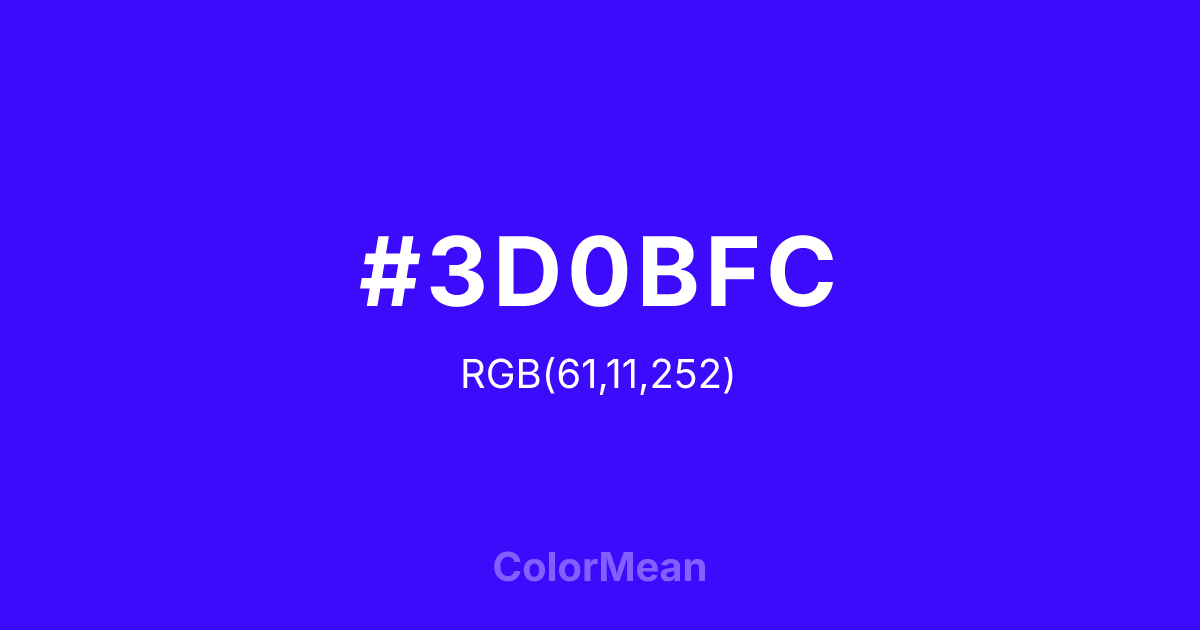 #3D0BFC RGB value is (61, 11, 252). The hex color red value is 61, green is 11, and blue is 252. Its HSL format shows a hue of 252°, saturation of 98 percent, and lightness of 52 percent. The CMYK process values are 76 percent, 96 percent, 0 percent, 1 percent.