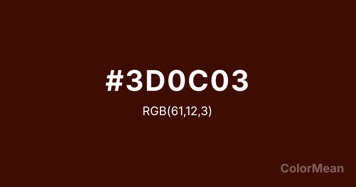 #3D0C03 RGB value is (61, 12, 3). The hex color red value is 61, green is 12, and blue is 3. Its HSL format shows a hue of 9°, saturation of 91 percent, and lightness of 13 percent. The CMYK process values are 0 percent, 80 percent, 95 percent, 76 percent.