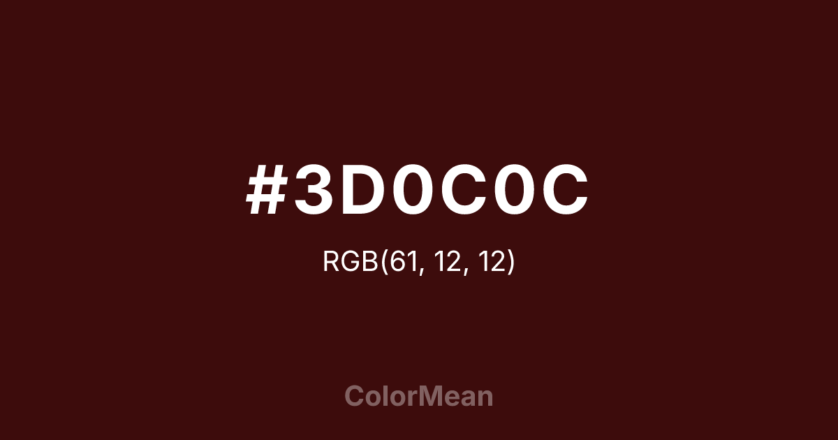#3D0C0C RGB value is (61, 12, 12). The hex color red value is 61, green is 12, and blue is 12. Its HSL format shows a hue of 0°, saturation of 67 percent, and lightness of 14 percent. The CMYK process values are 0 percent, 80 percent, 80 percent, 76 percent.