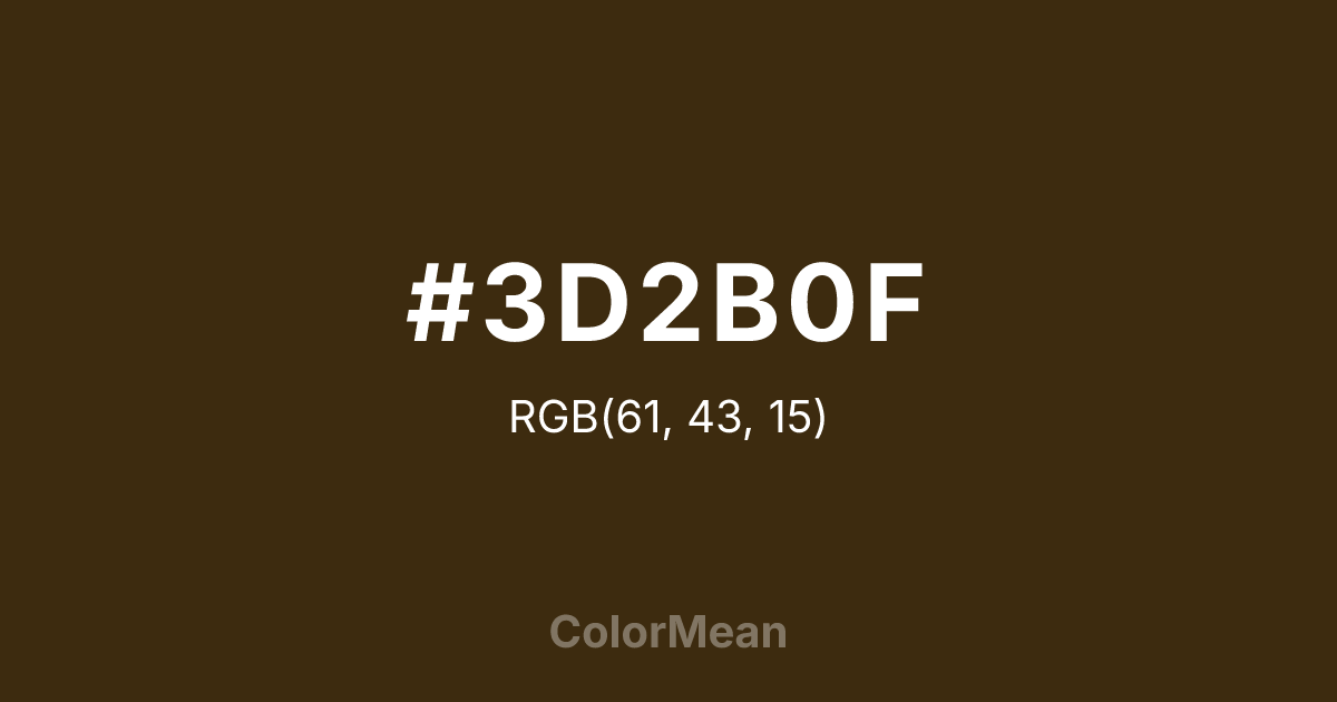 #3D2B0F RGB value is (61, 43, 15). The hex color red value is 61, green is 43, and blue is 15. Its HSL format shows a hue of 37°, saturation of 61 percent, and lightness of 15 percent. The CMYK process values are 0 percent, 30 percent, 75 percent, 76 percent.