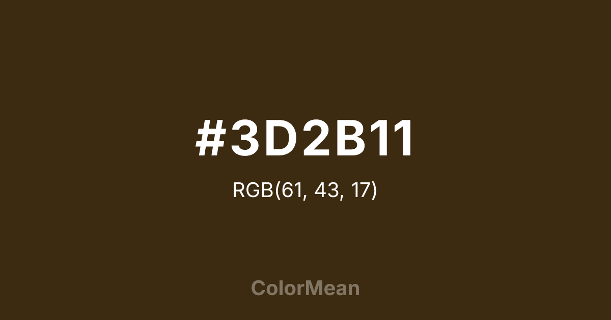 #3D2B11 RGB value is (61, 43, 17). The hex color red value is 61, green is 43, and blue is 17. Its HSL format shows a hue of 35°, saturation of 56 percent, and lightness of 15 percent. The CMYK process values are 0 percent, 30 percent, 72 percent, 76 percent.