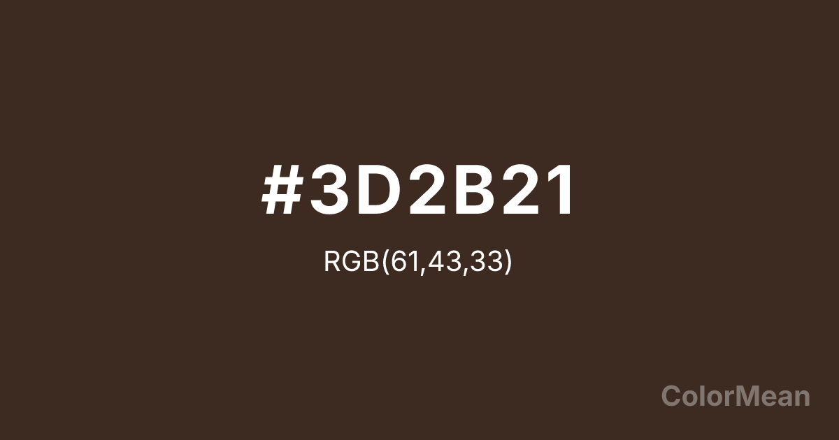 #3D2B21 RGB value is (61, 43, 33). The hex color red value is 61, green is 43, and blue is 33. Its HSL format shows a hue of 21°, saturation of 30 percent, and lightness of 18 percent. The CMYK process values are 0 percent, 30 percent, 46 percent, 76 percent.