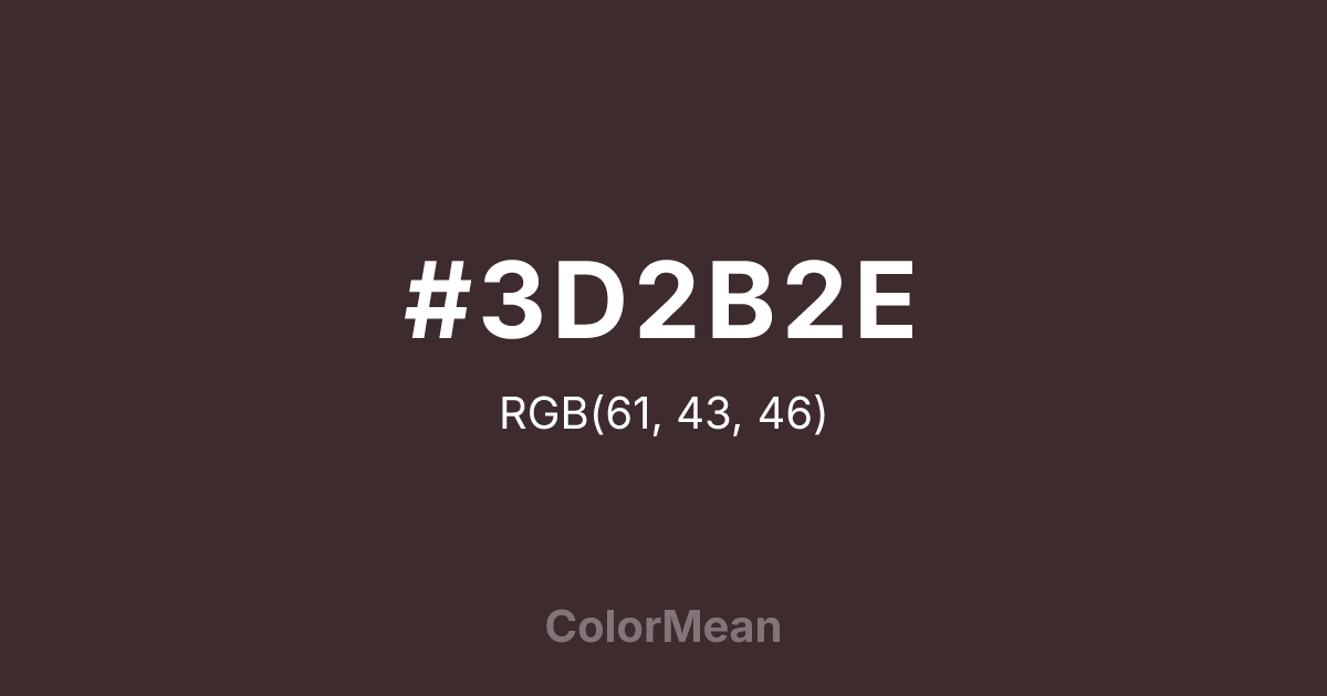 #3D2B2E RGB value is (61, 43, 46). The hex color red value is 61, green is 43, and blue is 46. Its HSL format shows a hue of 350°, saturation of 17 percent, and lightness of 20 percent. The CMYK process values are 0 percent, 30 percent, 25 percent, 76 percent.