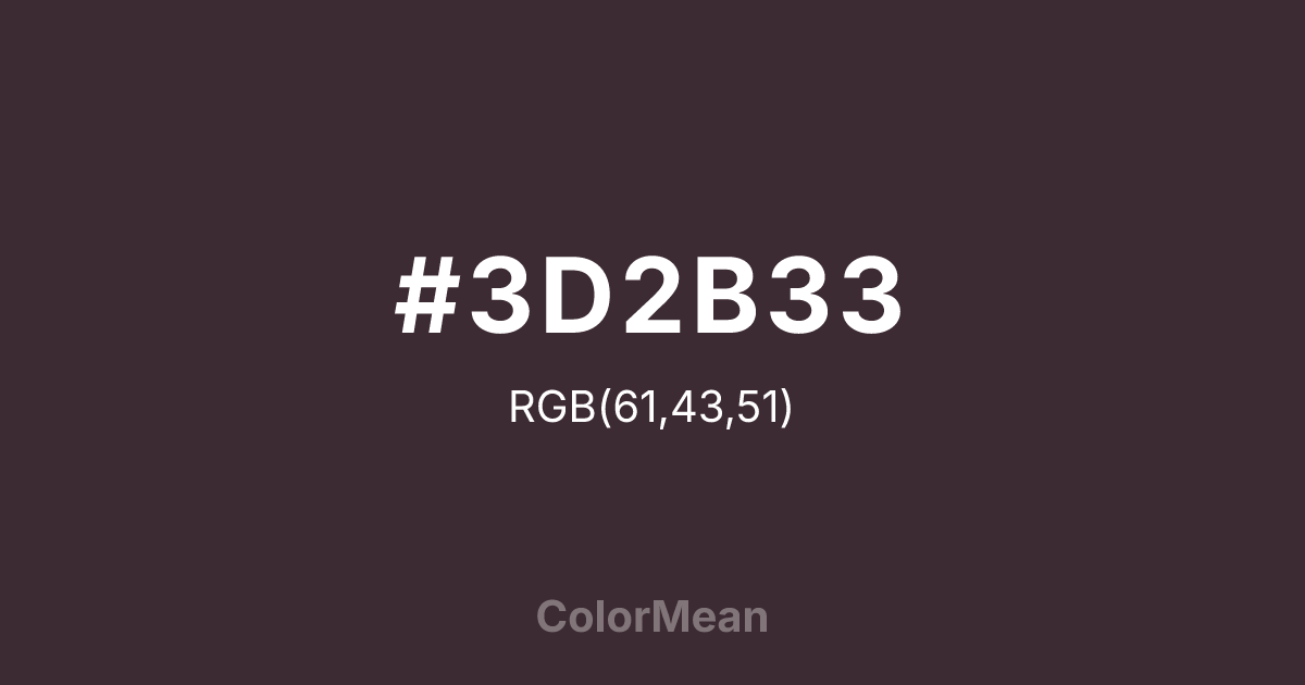 #3D2B33 RGB value is (61, 43, 51). The hex color red value is 61, green is 43, and blue is 51. Its HSL format shows a hue of 333°, saturation of 17 percent, and lightness of 20 percent. The CMYK process values are 0 percent, 30 percent, 16 percent, 76 percent.