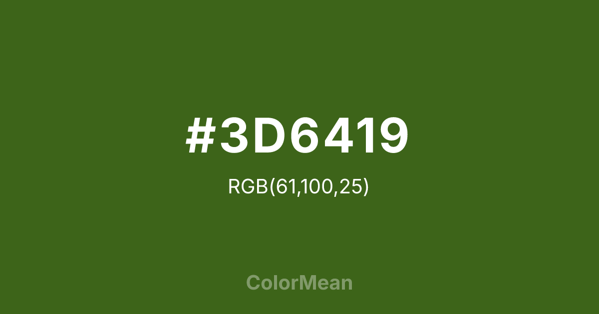 #3D6419 RGB value is (61, 100, 25). The hex color red value is 61, green is 100, and blue is 25. Its HSL format shows a hue of 91°, saturation of 60 percent, and lightness of 25 percent. The CMYK process values are 39 percent, 0 percent, 75 percent, 61 percent.