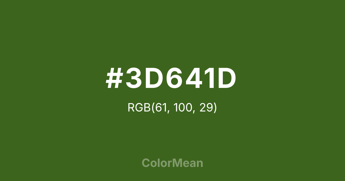 #3D641D RGB value is (61, 100, 29). The hex color red value is 61, green is 100, and blue is 29. Its HSL format shows a hue of 93°, saturation of 55 percent, and lightness of 25 percent. The CMYK process values are 39 percent, 0 percent, 71 percent, 61 percent.