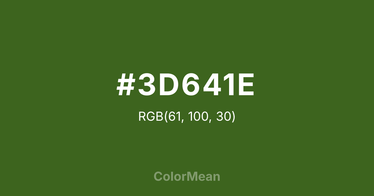 #3D641E RGB value is (61, 100, 30). The hex color red value is 61, green is 100, and blue is 30. Its HSL format shows a hue of 93°, saturation of 54 percent, and lightness of 25 percent. The CMYK process values are 39 percent, 0 percent, 70 percent, 61 percent.