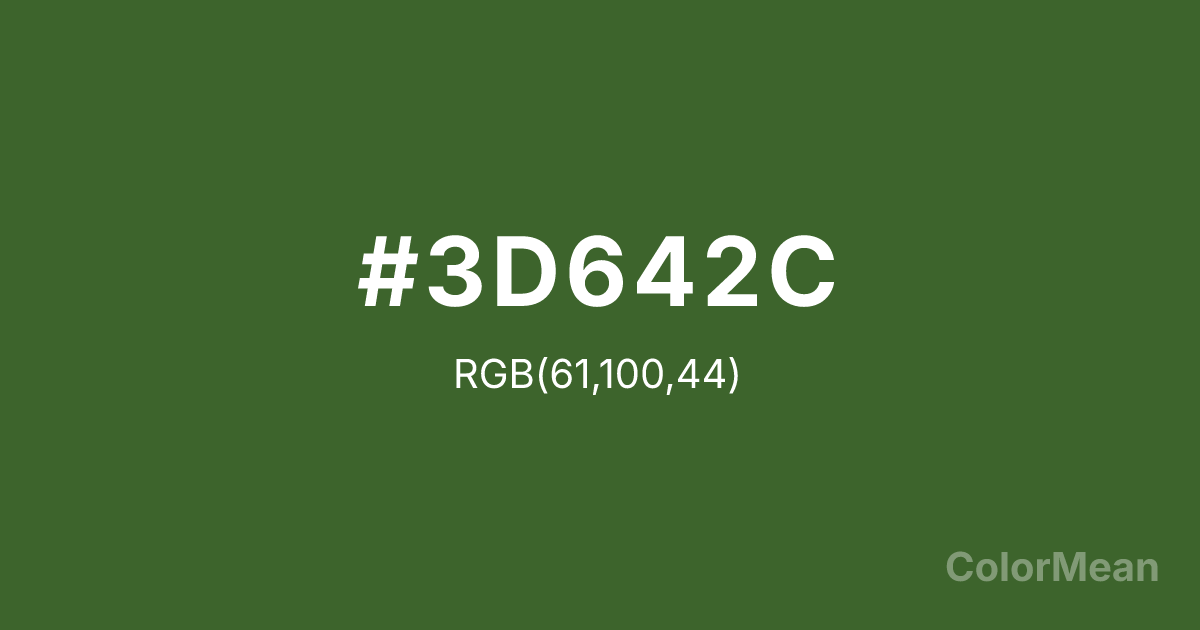 #3D642C RGB value is (61, 100, 44). The hex color red value is 61, green is 100, and blue is 44. Its HSL format shows a hue of 102°, saturation of 39 percent, and lightness of 28 percent. The CMYK process values are 39 percent, 0 percent, 56 percent, 61 percent.