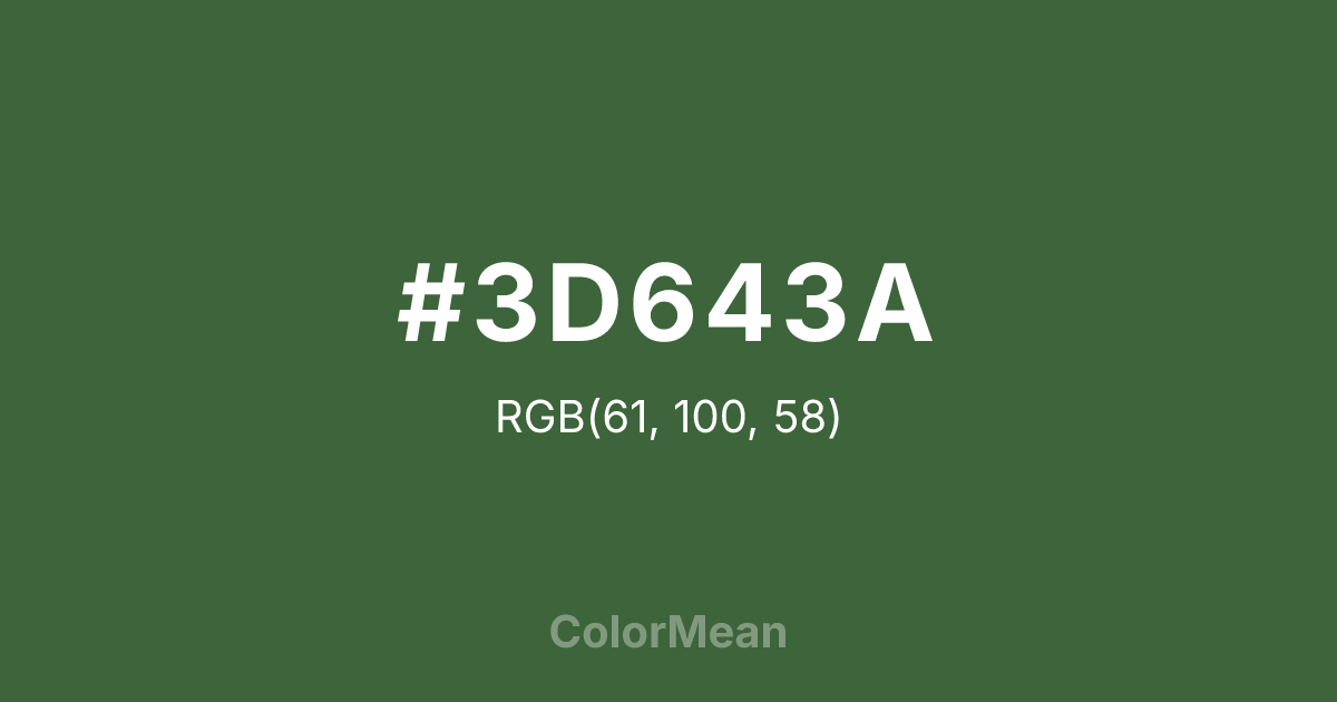 #3D643A RGB value is (61, 100, 58). The hex color red value is 61, green is 100, and blue is 58. Its HSL format shows a hue of 116°, saturation of 27 percent, and lightness of 31 percent. The CMYK process values are 39 percent, 0 percent, 42 percent, 61 percent.