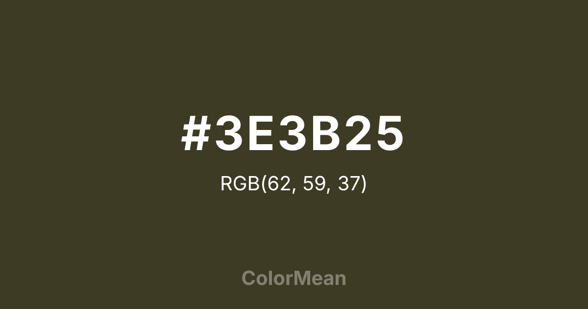 #3E3B25 RGB value is (62, 59, 37). The hex color red value is 62, green is 59, and blue is 37. Its HSL format shows a hue of 53°, saturation of 25 percent, and lightness of 19 percent. The CMYK process values are 0 percent, 5 percent, 40 percent, 76 percent.