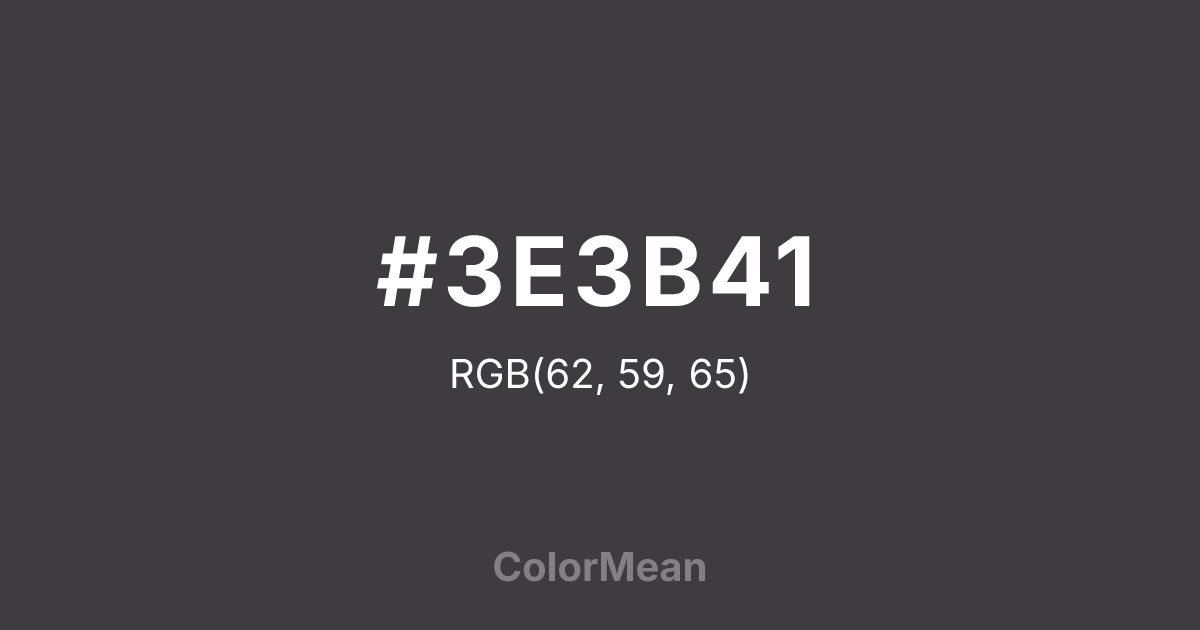 #3E3B41 RGB value is (62, 59, 65). The hex color red value is 62, green is 59, and blue is 65. Its HSL format shows a hue of 270°, saturation of 5 percent, and lightness of 24 percent. The CMYK process values are 5 percent, 9 percent, 0 percent, 75 percent.