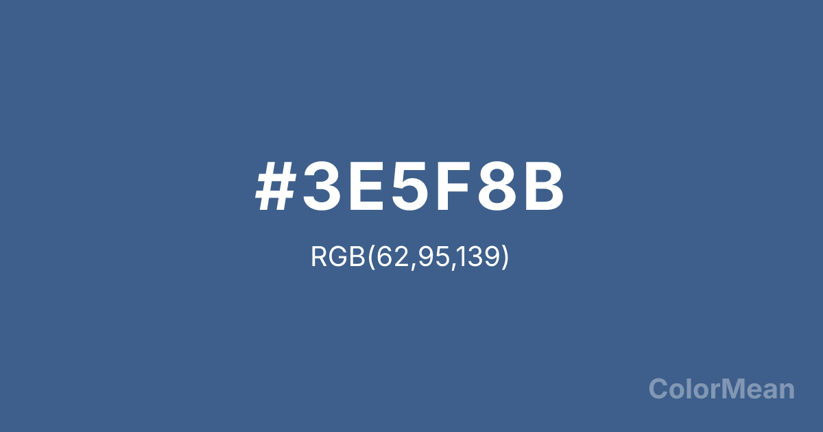 #3E5F8B RGB value is (62, 95, 139). The hex color red value is 62, green is 95, and blue is 139. Its HSL format shows a hue of 214°, saturation of 38 percent, and lightness of 39 percent. The CMYK process values are 55 percent, 32 percent, 0 percent, 45 percent.