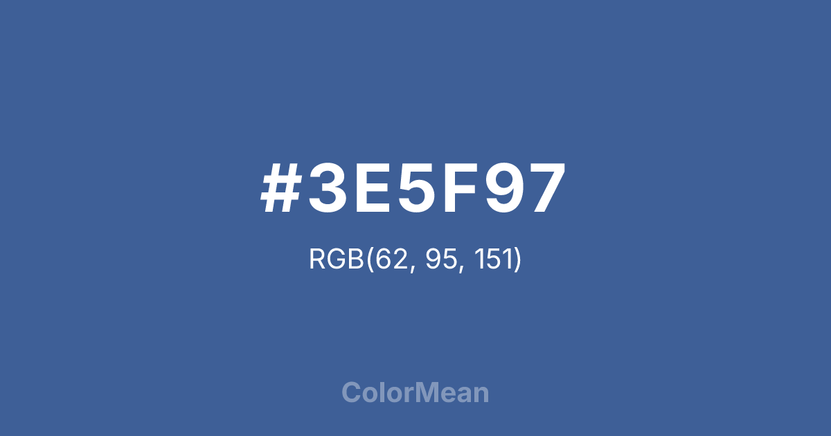 #3E5F97 RGB value is (62, 95, 151). The hex color red value is 62, green is 95, and blue is 151. Its HSL format shows a hue of 218°, saturation of 42 percent, and lightness of 42 percent. The CMYK process values are 59 percent, 37 percent, 0 percent, 41 percent.