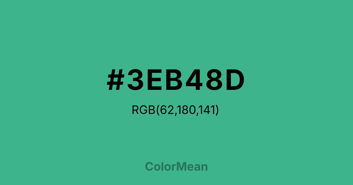 #3EB48D RGB value is (62, 180, 141). The hex color red value is 62, green is 180, and blue is 141. Its HSL format shows a hue of 160°, saturation of 49 percent, and lightness of 47 percent. The CMYK process values are 66 percent, 0 percent, 22 percent, 29 percent.
