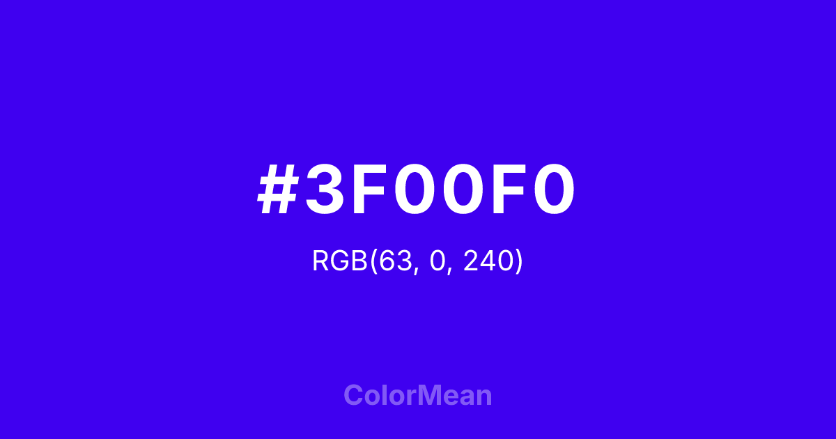 #3F00F0 RGB value is (63, 0, 240). The hex color red value is 63, green is 0, and blue is 240. Its HSL format shows a hue of 256°, saturation of 100 percent, and lightness of 47 percent. The CMYK process values are 74 percent, 100 percent, 0 percent, 6 percent.