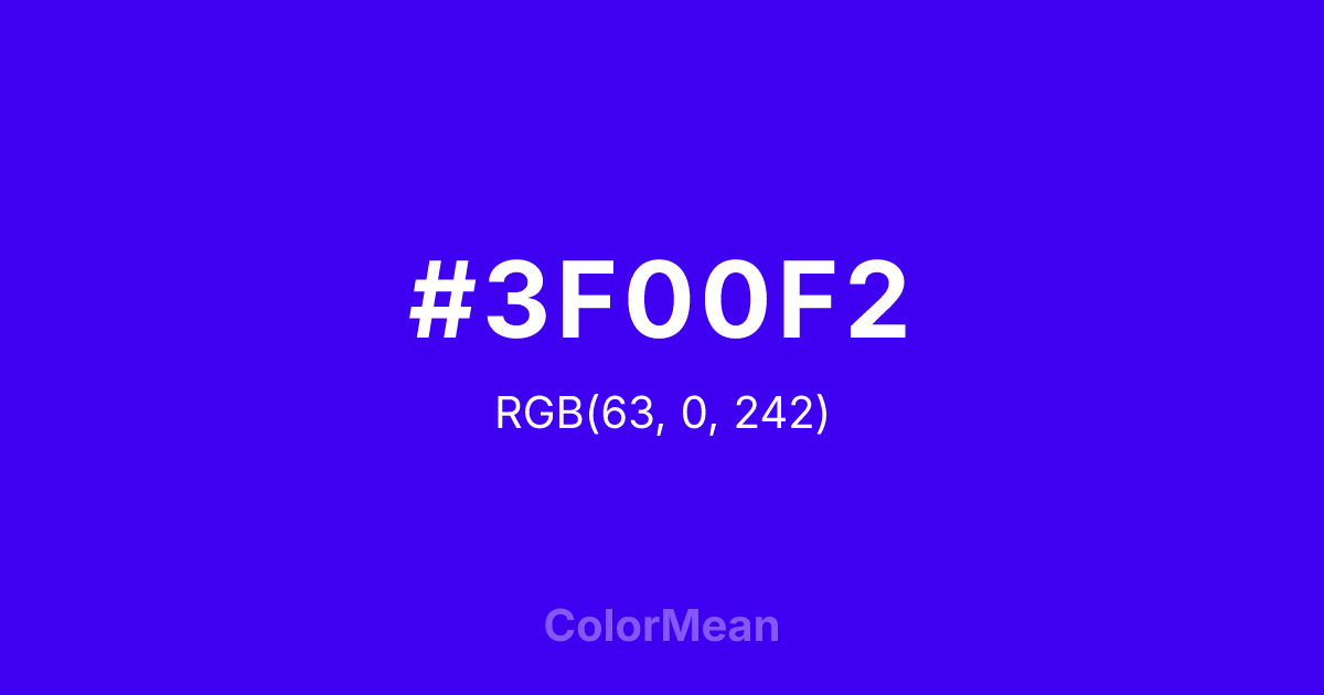 #3F00F2 RGB value is (63, 0, 242). The hex color red value is 63, green is 0, and blue is 242. Its HSL format shows a hue of 256°, saturation of 100 percent, and lightness of 47 percent. The CMYK process values are 74 percent, 100 percent, 0 percent, 5 percent.