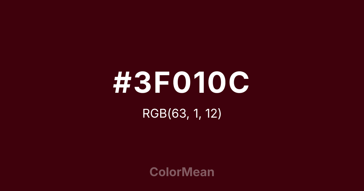 #3F010C RGB value is (63, 1, 12). The hex color red value is 63, green is 1, and blue is 12. Its HSL format shows a hue of 349°, saturation of 97 percent, and lightness of 13 percent. The CMYK process values are 0 percent, 98 percent, 81 percent, 75 percent.