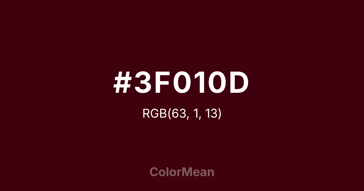 #3F010D RGB value is (63, 1, 13). The hex color red value is 63, green is 1, and blue is 13. Its HSL format shows a hue of 348°, saturation of 97 percent, and lightness of 13 percent. The CMYK process values are 0 percent, 98 percent, 79 percent, 75 percent.