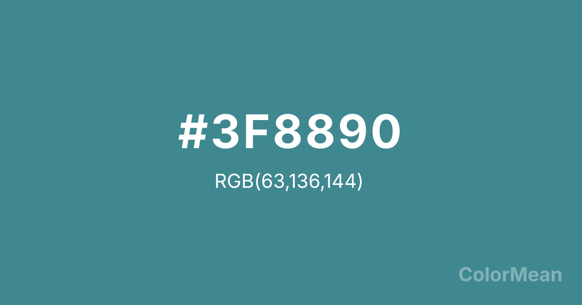 #3F8890 RGB value is (63, 136, 144). The hex color red value is 63, green is 136, and blue is 144. Its HSL format shows a hue of 186°, saturation of 39 percent, and lightness of 41 percent. The CMYK process values are 56 percent, 6 percent, 0 percent, 44 percent.