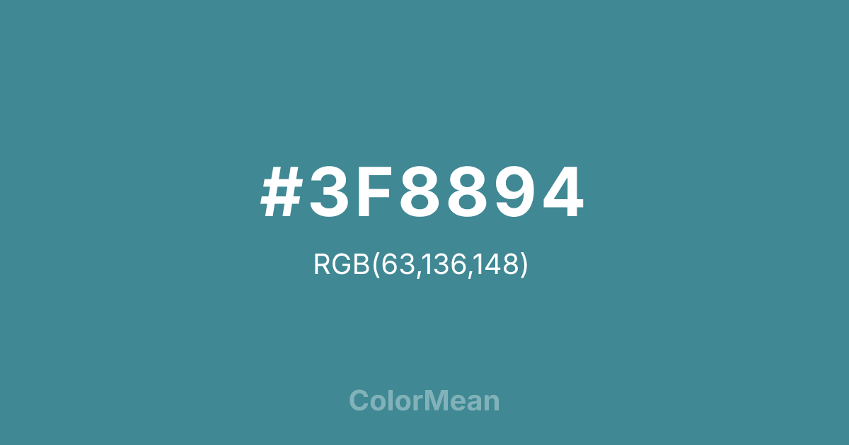 #3F8894 RGB value is (63, 136, 148). The hex color red value is 63, green is 136, and blue is 148. Its HSL format shows a hue of 188°, saturation of 40 percent, and lightness of 41 percent. The CMYK process values are 57 percent, 8 percent, 0 percent, 42 percent.