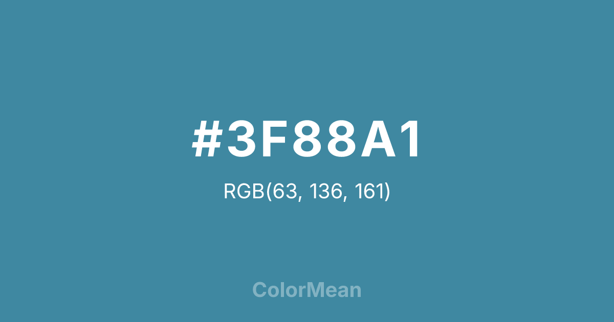 #3F88A1 RGB value is (63, 136, 161). The hex color red value is 63, green is 136, and blue is 161. Its HSL format shows a hue of 195°, saturation of 44 percent, and lightness of 44 percent. The CMYK process values are 61 percent, 16 percent, 0 percent, 37 percent.