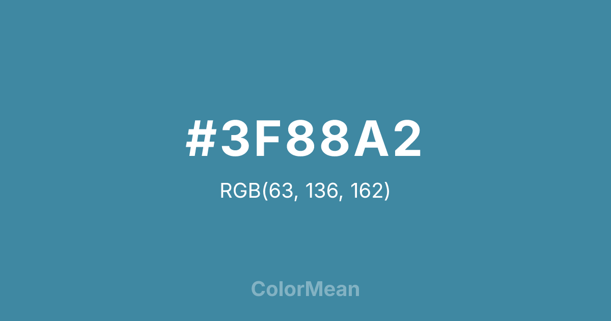 #3F88A2 RGB value is (63, 136, 162). The hex color red value is 63, green is 136, and blue is 162. Its HSL format shows a hue of 196°, saturation of 44 percent, and lightness of 44 percent. The CMYK process values are 61 percent, 16 percent, 0 percent, 36 percent.